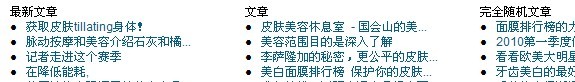 我第一個站的關(guān)鍵詞是美白面膜排行榜第二個關(guān)鍵詞做的是護膚品排行榜。前面一個詞的百度指數(shù)是600多,后面一個詞的百度指數(shù),是900多,而且現(xiàn)在做這兩個詞的淘寶客又很多,可以看出兩個詞還是蠻有難度的。我把這個兩個詞做上去就的秘密武器就“更新帶動器”。我的程序是用z-blog博客系統(tǒng)改的,下面的一排文字就是文章的標題,也就是所謂的“更新帶動器“,如圖所示: