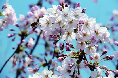 昨天上午,記者在中山公園發(fā)現(xiàn),因為天氣晴朗,眾多市民、游客涌入中山公園,讓游客們感覺可惜的是,公園里的櫻花還很羞澀地含著花骨朵,有的櫻花樹上,開放的花朵也不過占總數(shù)的一成左右,但這并沒有太多影響大家的興致!罢嫫婀郑趺淳瓦@一棵開得那么好!”記者發(fā)現(xiàn)這株櫻花并不大,但樹上的櫻花已經(jīng)全部開放,還有幾只蜜蜂在花叢中飛來飛去,吸引了不少游客的鏡頭。