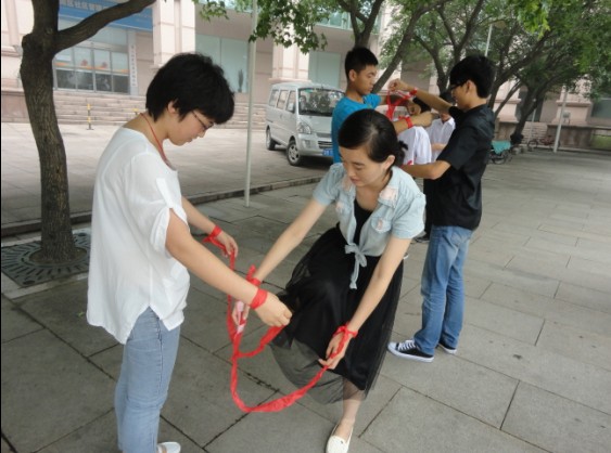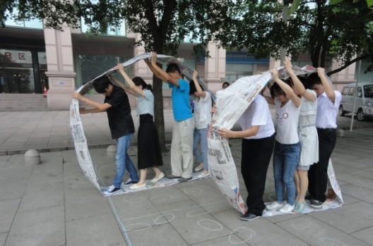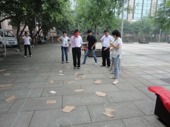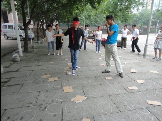 第二個環(huán)節(jié)叫做越獄,我們在地面上用粉筆畫出一片區(qū)域,里面擺放很多硬紙殼作為地雷。每隊各派一位隊員穿越雷區(qū),這位隊員需要蒙住眼睛,在其他隊員的指揮下,在不踩到地雷的情況下,從雷區(qū)的一段走到另外一端。哪個隊成功的人數(shù)多則為獲勝組。