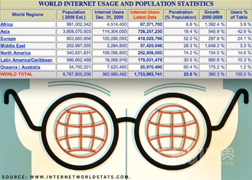 在未來10年間,互聯(lián)網(wǎng)的大規(guī)模擴(kuò)張將主要出自發(fā)展中國家。根據(jù)Internet World Stats的統(tǒng)計,互聯(lián)網(wǎng)普及率最低的地區(qū)是非洲(6.8%)、亞洲(19.4%)和中東(28.3%),而北美地區(qū)的普及率則為74.2%。這個趨勢表明,2020年的互聯(lián)網(wǎng)不僅將到達(dá)全球更遙遠(yuǎn)的地方,而且還將支持更多種語言和非ASCII腳本。