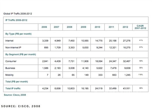 研究人員已經(jīng)杜撰出了術(shù)語“數(shù)字洪水”(exaflood)來描繪互聯(lián)網(wǎng)上迅猛增長的數(shù)據(jù)流量(尤其是高清圖像和高清視頻流量)。思科預(yù)計,到 2012年,互聯(lián)網(wǎng)每個月的流量將會增加44艾字節(jié)(exabyte,109GB),僅這個每月的增量就是今天互聯(lián)網(wǎng)流量的一倍多。這些迅猛增加的流量不 是像傳統(tǒng)的Tier 1等ISP所產(chǎn)生的,而是像Google這樣的內(nèi)容提供商所產(chǎn)生的。這種轉(zhuǎn)移,激發(fā)了人們將互聯(lián)網(wǎng)重新設(shè)計為內(nèi)容網(wǎng)絡(luò)而不是傳輸網(wǎng)絡(luò)的興趣。