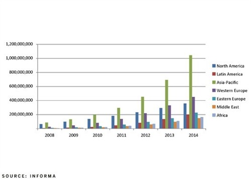 根據(jù)Informa公司的統(tǒng)計,2009年第二季度,全球移動寬帶的用戶數(shù)已突破2.57億。這表示3G、WiMAX和其他更高速的數(shù)據(jù)網(wǎng)絡(luò)技術(shù) 的年增長率在85%左右。近年來,亞洲是無線寬帶用戶數(shù)最多的地區(qū),而拉美是用戶數(shù)增長最快的地區(qū)。Informa估計,到2014年,全球?qū)⒂?5億人 會成為移動寬帶的用戶。