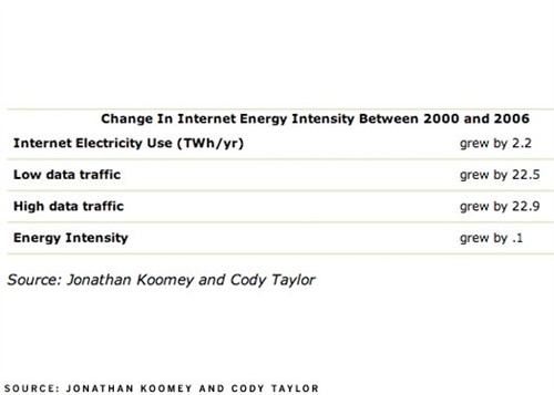 今天,互聯(lián)網(wǎng)的運營消耗了太多的能源。根據(jù)勞倫斯伯克利國家實驗室的計算,在2000年到2006年間,互聯(lián)網(wǎng)所消耗的能量翻了一番。專家們一致 認(rèn)為,未來的互聯(lián)網(wǎng)架構(gòu)需要更注重能源效率。然而,當(dāng)網(wǎng)絡(luò)技術(shù)變得越來越節(jié)能時,互聯(lián)網(wǎng)的能量密集度的增長卻落后于數(shù)據(jù)流量的增長。因此,當(dāng)能源價格越來 越高的時候,互聯(lián)網(wǎng)向更為綠色的方向發(fā)展的趨勢將會加速。