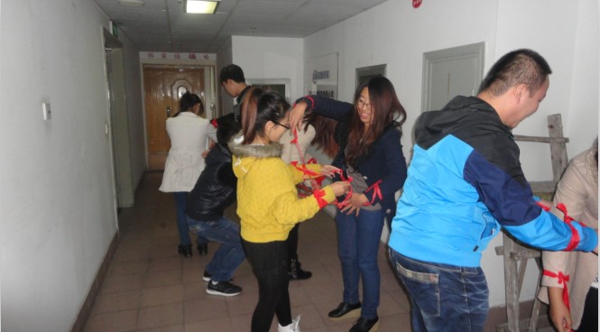 下午16:30,我們的人力資源總監(jiān)帶領(lǐng)新員工來到公司門口,將10位同學(xué)分成兩組,進(jìn)行拓展訓(xùn)練的PK。本次拓展訓(xùn)練共分為兩個(gè)環(huán)節(jié)。第一環(huán)節(jié)叫做打開同心結(jié),游戲規(guī)則是每兩個(gè)隊(duì)員一組,各分到一根繩子,兩根繩子交叉擺放,各人將自己所持繩子的兩段分別系在自己兩個(gè)手腕上,系好后,兩人的繩子交結(jié)在一起。兩人需要在不破壞繩子、不打開繩結(jié)的情況下將兩條繩子分開,限時(shí)10分鐘,用最短時(shí)間成功分開的一組為獲勝組。