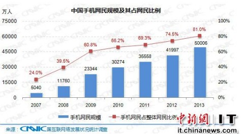 今日,中國互聯(lián)網(wǎng)信息中心發(fā)布了第33次《中國互聯(lián)網(wǎng)絡發(fā)展狀況統(tǒng)計報告》(以下簡稱報告)。報告顯示,截至2013年12月,中國手機網(wǎng)民規(guī)模達5億,較2012年底增加8009萬人,使用手機上網(wǎng)網(wǎng)民比例保持較快增長,從74.5%上升至81.0%,提升6.5個百分點。