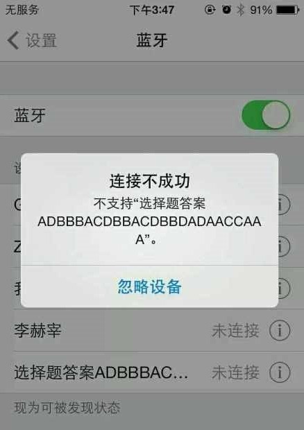 以為有了信號屏蔽器我就沒辦法了?看看我神奇大藍牙。答案照樣抄到不解釋。原來信號與藍牙的通信信道不一樣,所以信號屏蔽器是無法屏蔽藍牙的。