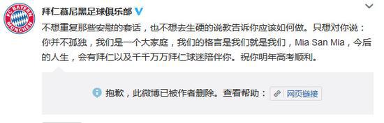 這些訊息迅速在各個(gè)圈子引發(fā)傳播,包括拜仁慕尼黑官方微博在內(nèi)的多個(gè)機(jī)構(gòu)或個(gè)人認(rèn)證用戶轉(zhuǎn)發(fā),并送上祝福和鼓勵(lì)。此舉帶動(dòng)了更多網(wǎng)友轉(zhuǎn)發(fā)參與。(拜仁官網(wǎng)轉(zhuǎn)發(fā)截圖,現(xiàn)已刪除)