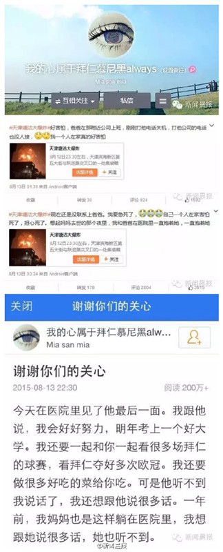 一位微博ID為“我的心屬于拜仁慕尼黑always”(現(xiàn)已改名)的網(wǎng)友接連發(fā)布兩條微博,以“天津塘沽大爆炸”為話題標(biāo)簽,聲稱自己的爸爸在天津爆炸中失聯(lián),自己非常著急,并透露母親已去世。