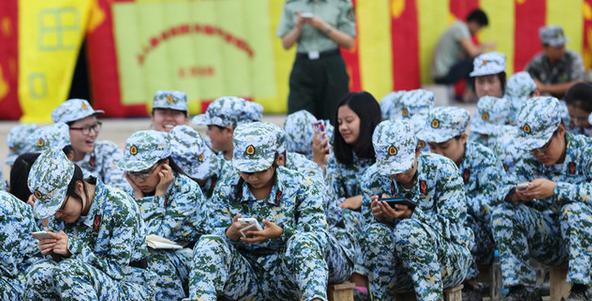 2015年8月25日,北京,北京大學(xué)2015年學(xué)生軍訓(xùn)團(tuán)進(jìn)行消防演練及體驗(yàn)活動(dòng)。軍訓(xùn)不是不可以帶手機(jī)的嗎?想當(dāng)年俺們軍訓(xùn),就只能帶瓶水(哈哈,一不小心暴漏年齡了!)?纯,人家教官都在玩手機(jī)。這頭帶的好(教官掏出手機(jī)說,玩手機(jī)5分鐘,玩笑話)!