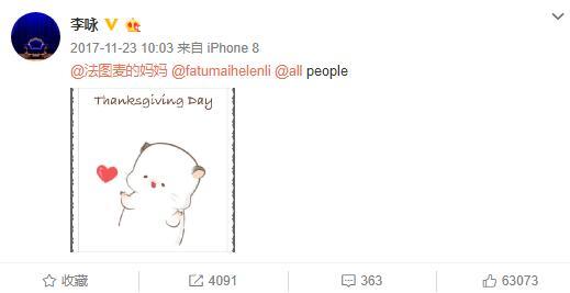 兩年后,李詠發(fā)布圖片:“Thanksgiving Day”。他@了妻子和女兒,以及“all people”。那是他生前的最后一條微博。