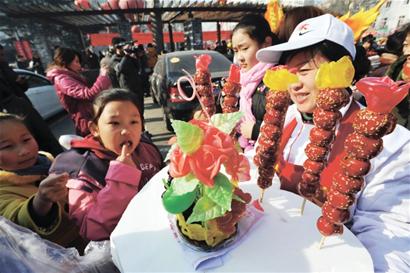 情人節(jié)臨近,糖球會(huì)上的不少民俗藝人也紛紛湊熱鬧,亮出了自己的“民俗玫瑰”:糖球玫瑰、面塑玫瑰、糖稀玫瑰、糖畫(huà)玫瑰……各種玫瑰新品種吸引了許多趕會(huì)的年輕人。